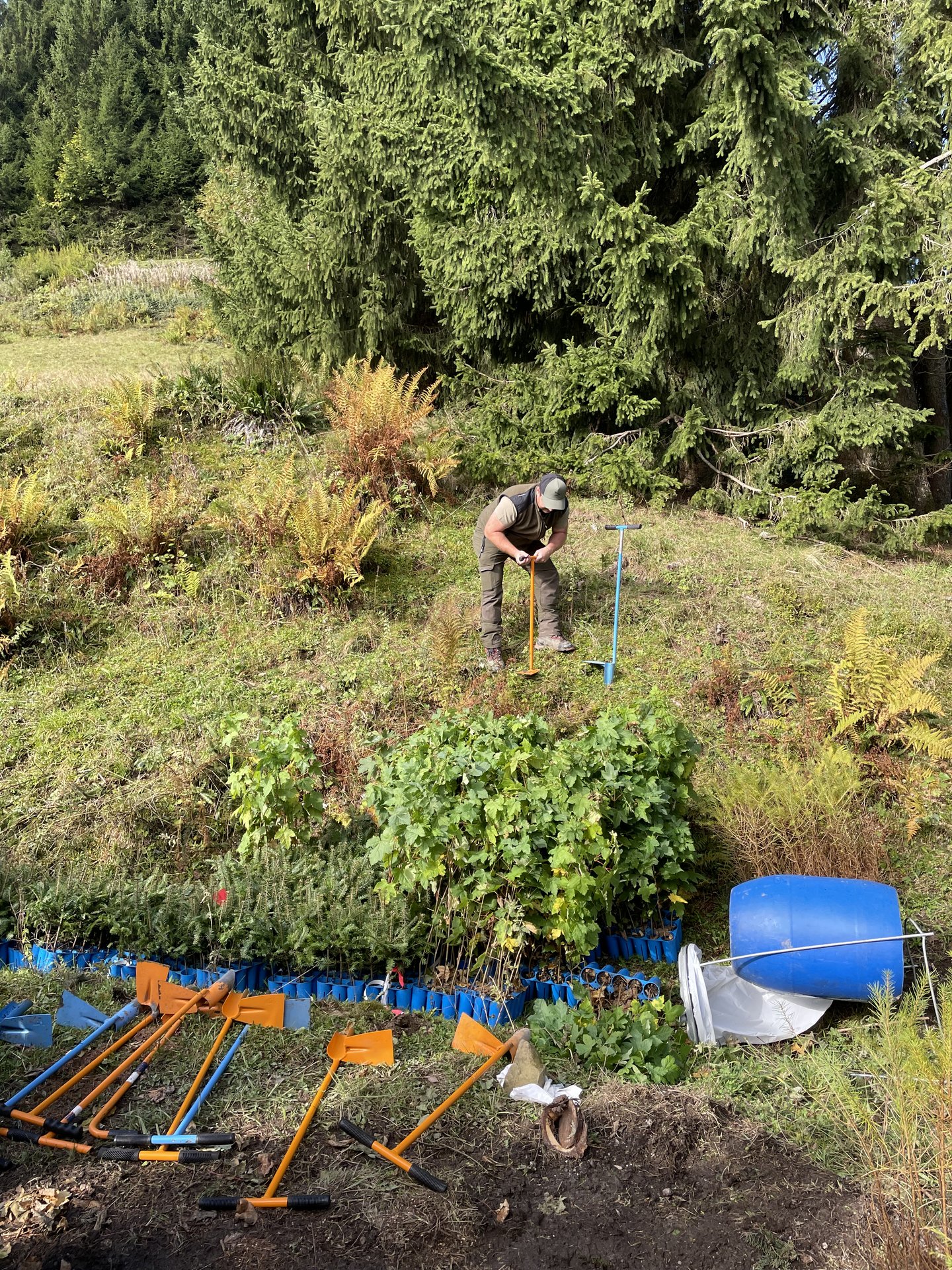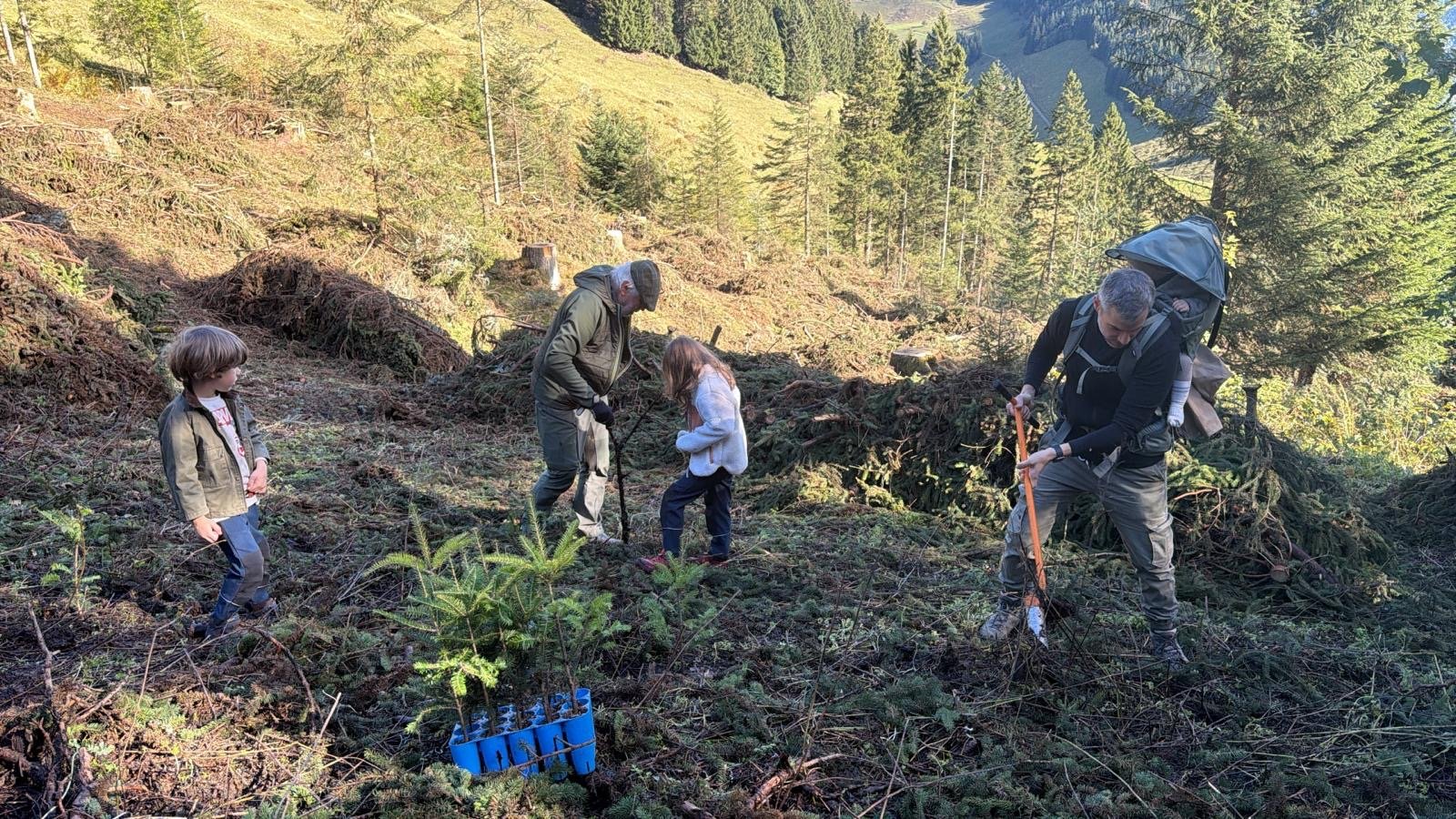 Matthias vom Forstamt erklärt wie gepflanzt wird. Im Vordergrund ein Teil der Jungbäumchen Weißtanne, Lärche und Bergahorn.