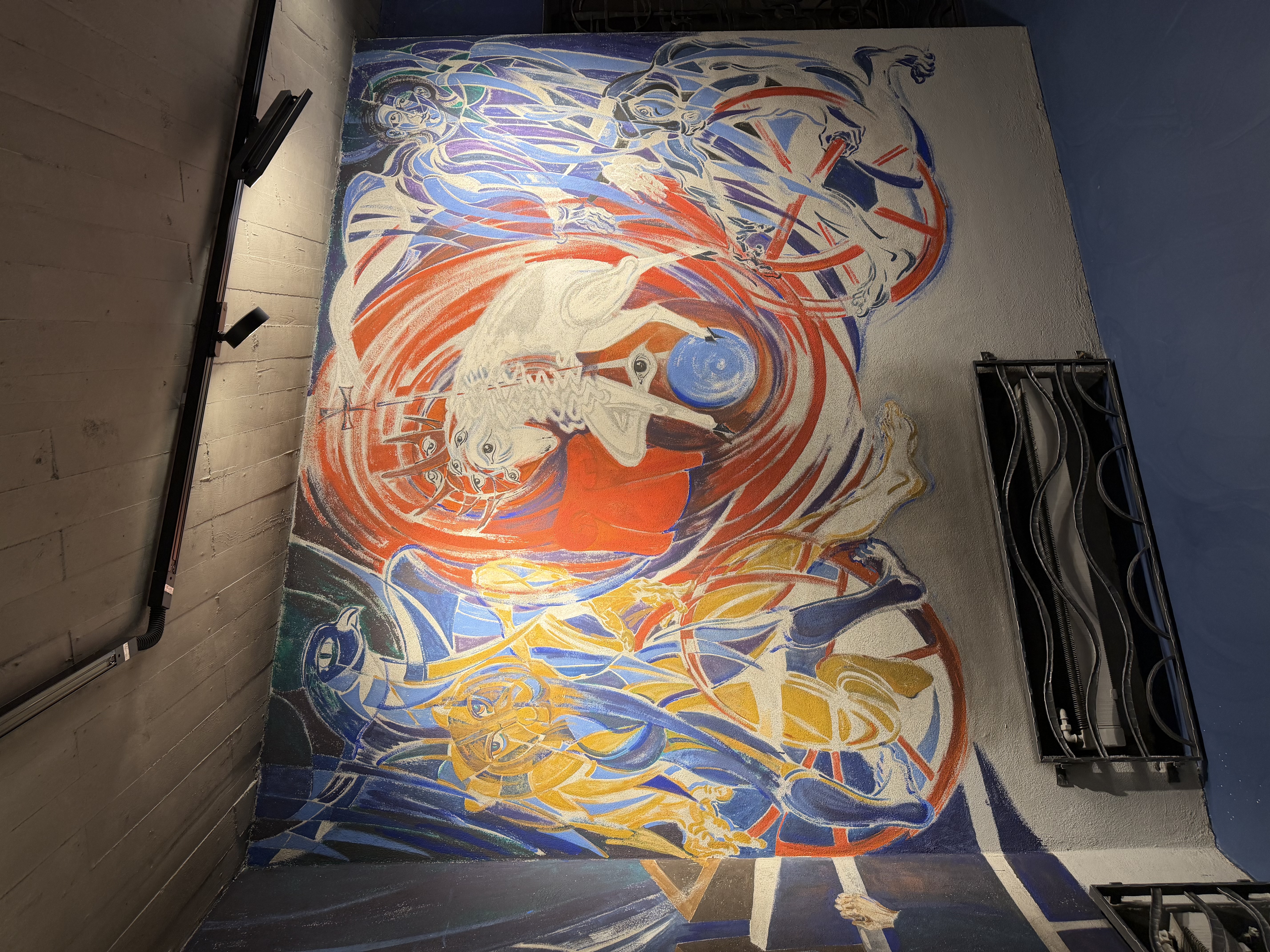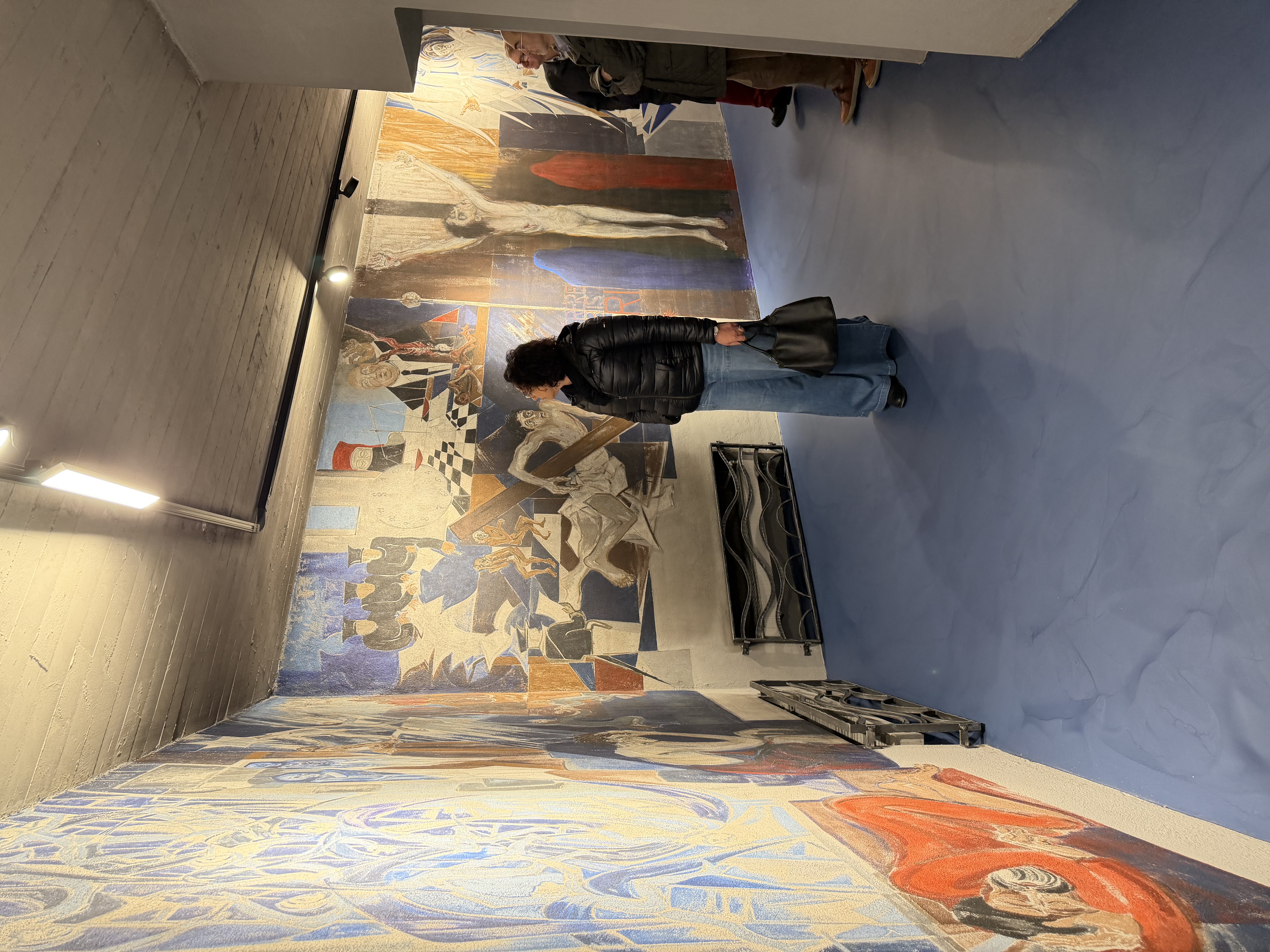 In der Unterkirche entstand zu Beginn der 1980er-Jahre ein beeindruckendes Kunstwerk: Die Hohenemser Künstlerin Heilgard Bertel erhielt damals den Auftrag, die Betonwände künstlerisch zu gestalten. Ziel war es, die Krypta als Meditations- und Diskussionsraum für Jugendliche zu nutzen. Und ja – die Darstellungen waren und sind Diskussionsstoff. Genau das macht sie so kraftvoll, führte jedoch gleichzeitig auch zu Kontroversen; sogar eine Übermalung wurde in Erwägung gezogen. Schlussendlich versank der Raum für Jahrzehnte in eine Art Dornröschenschlaf.