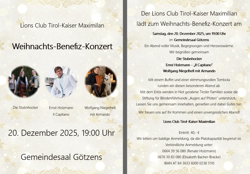 Der Lions Club Tirol-Kaiser Maximilian lädt zum jährlichen Weihnachts-Benefiz-Konzert!